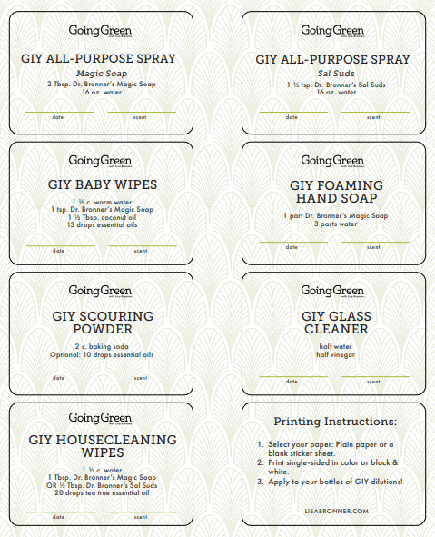 Here’s a set of handy labels to print out for the recipes that I use the most. These say not only what’s in the bottle, but also what’s needed to refill it. They can be printed on sticker paper or on plain paper. Either way, to keep them legible even if they get wet during use, you may want to print on vinyl sticker sheets (we tested Buttercrafts brand) or tape over them on your container with clear packaging tape.