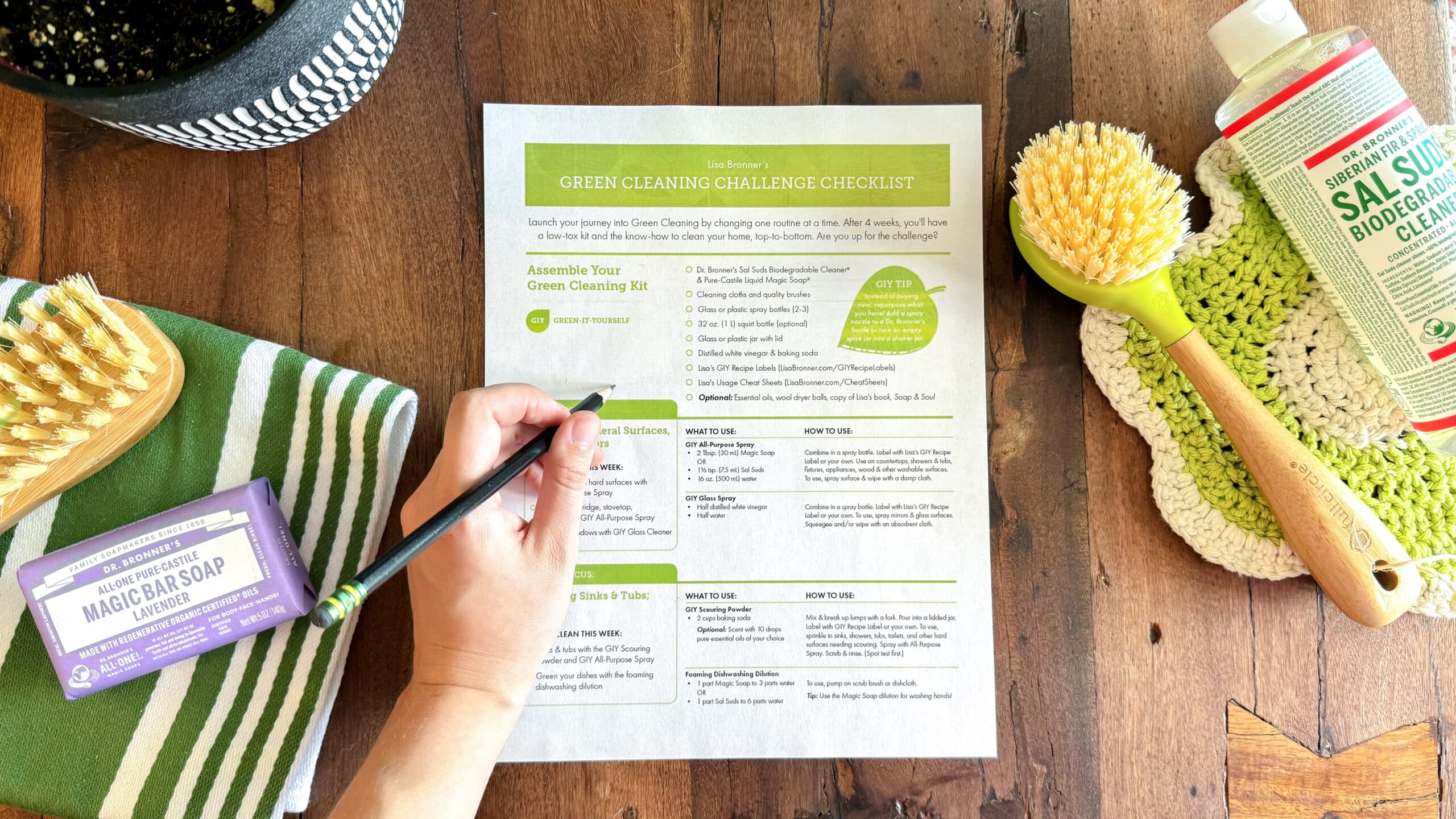 I’ve written this “Green Cleaning Challenge Checklist” to make it easy to launch your journey into green cleaning by changing one routine at a time. After 4 weeks, you’ll have a low-tox kit and the know-how to clean your home, top-to-bottom with effective cleaners that are easy to remember. This challenge will take you from completely conventional to deeply green, guiding you through replacing your conventional cleaning products with more natural cleaning alternatives. By the end, you’ll have created a robust DIY non-toxic cleaning arsenal.